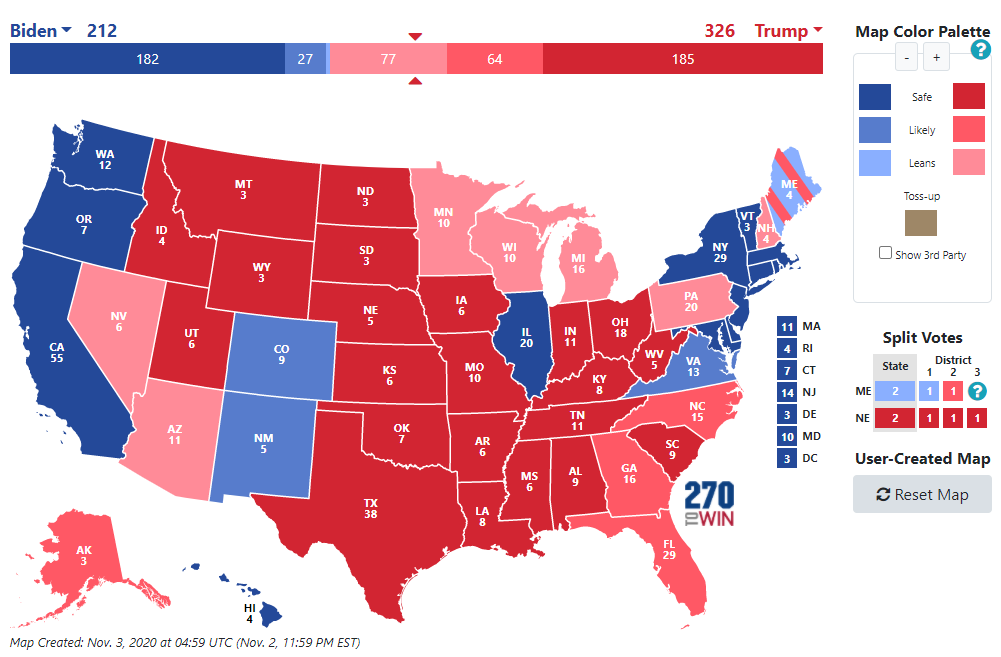 Whilst this is my baseline case for Trump’s electoral college map, I do think there is an outlier chance that the Rural Wave could overwhelm the Democratic defenses in safe Democratic states like Colorado, Maine, New Mexico and so on. Whilst unlikely, that could push the final tally closer to John Greer’s forecast of 350 electoral college forecast. As I said, unlikely but not impossible depending upon the turnout today.